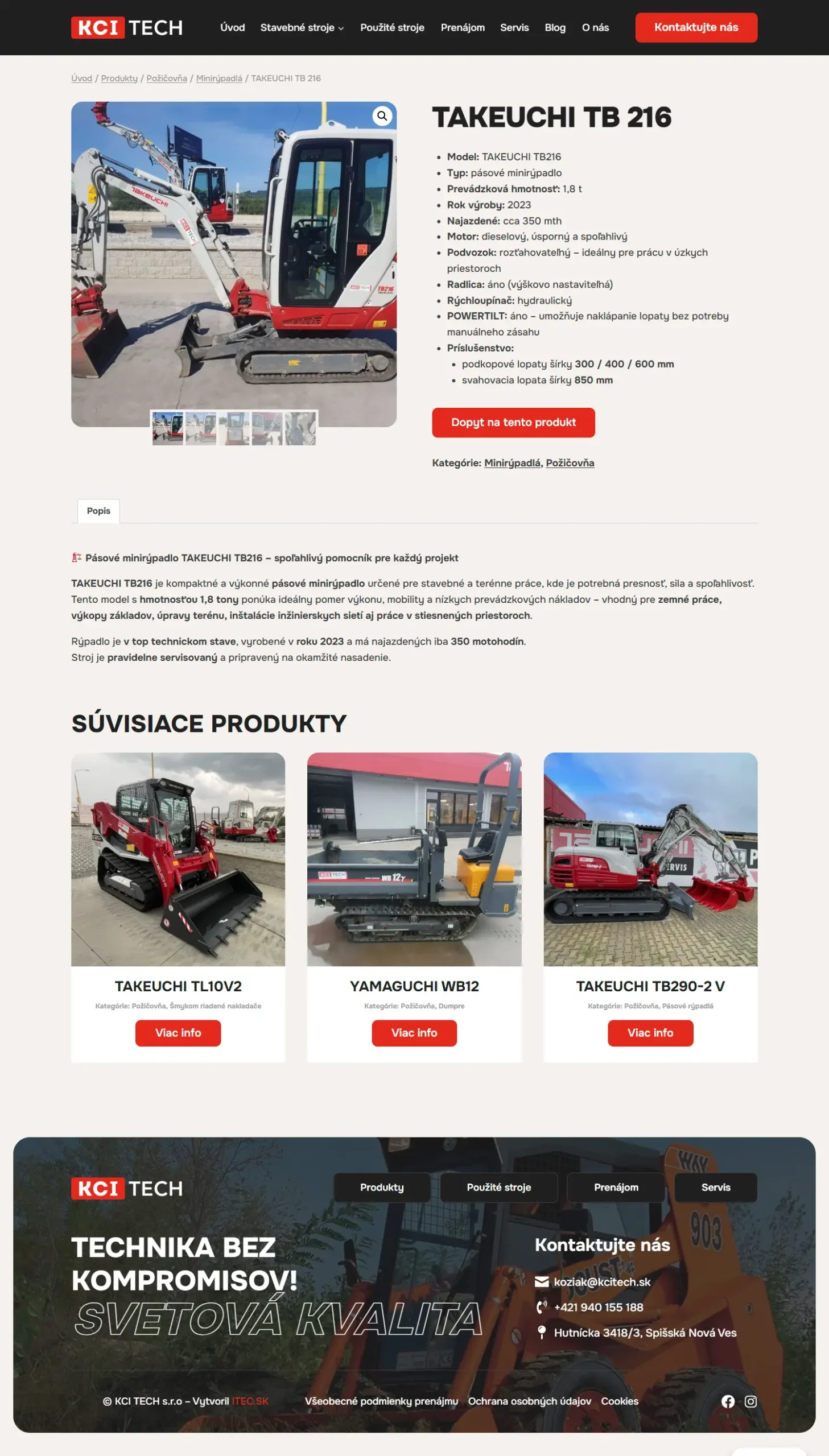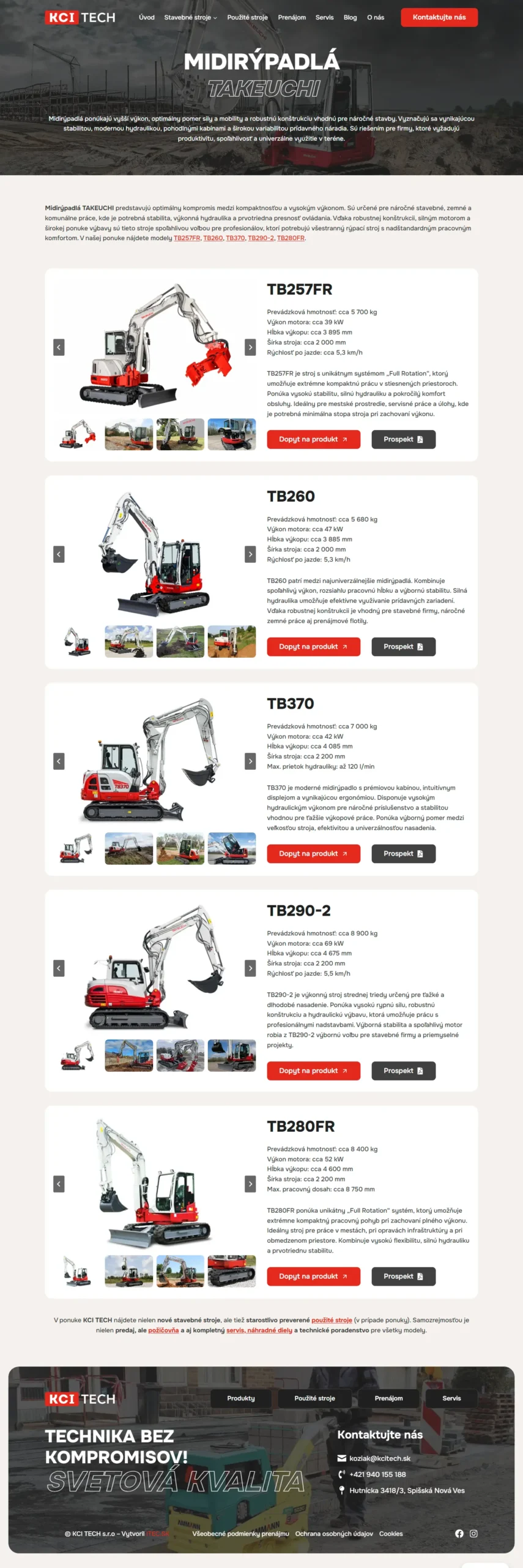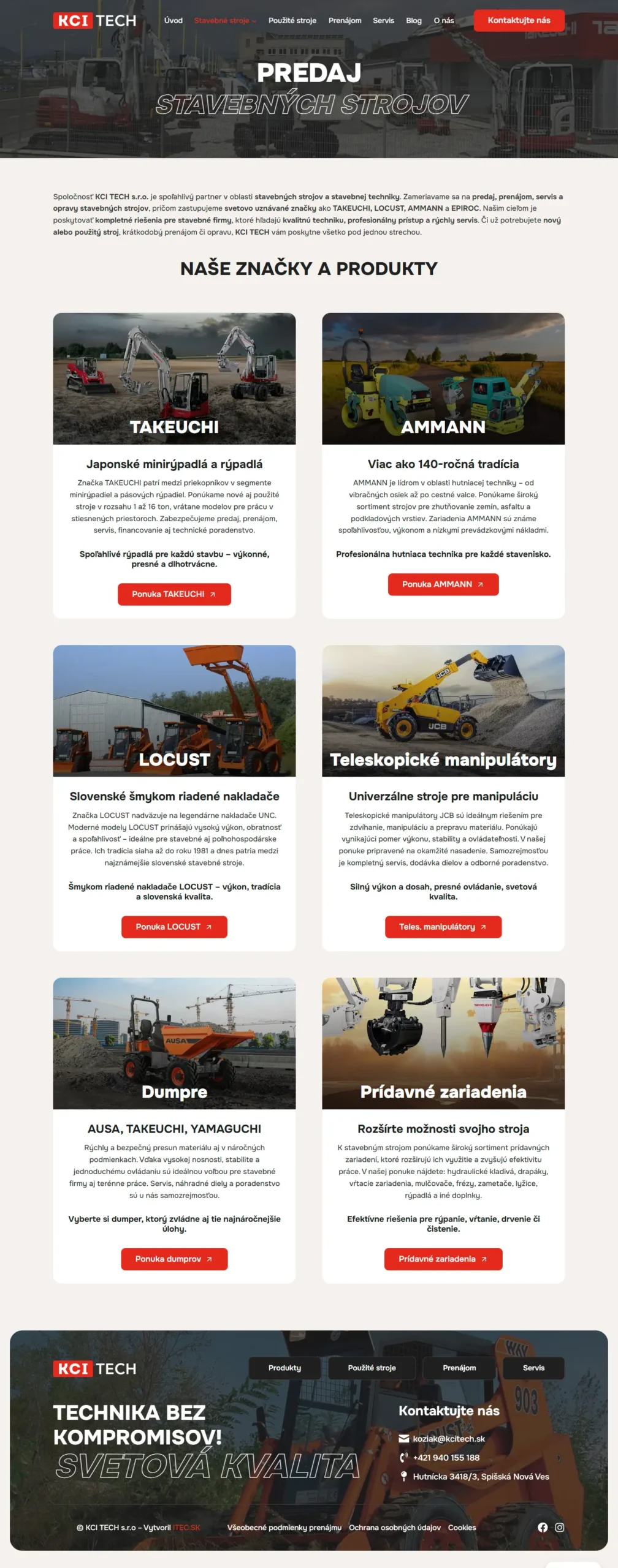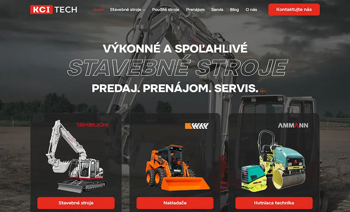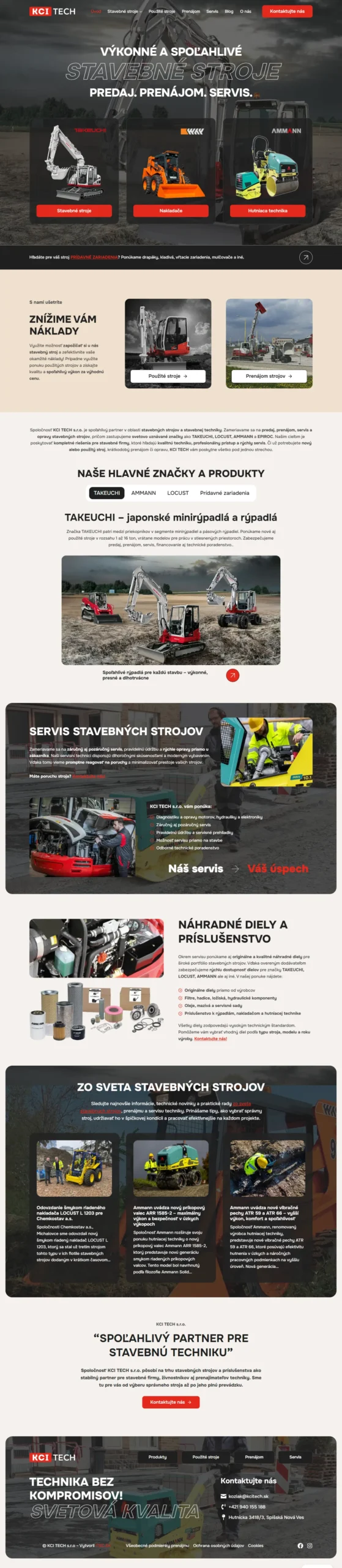 Web reflektuje komplexné služby spoločnosti KCI TECH – predaj nových a použitých stavebných strojov, krátkodobý aj dlhodobý prenájom, servis a opravy. Firma zastupuje renomované značky TAKEUCHI, LOCUST, AMMANN a EPIROC a poskytuje kompletné riešenia pre stavebné firmy, ktoré požadujú spoľahlivú techniku a profesionálny prístup.