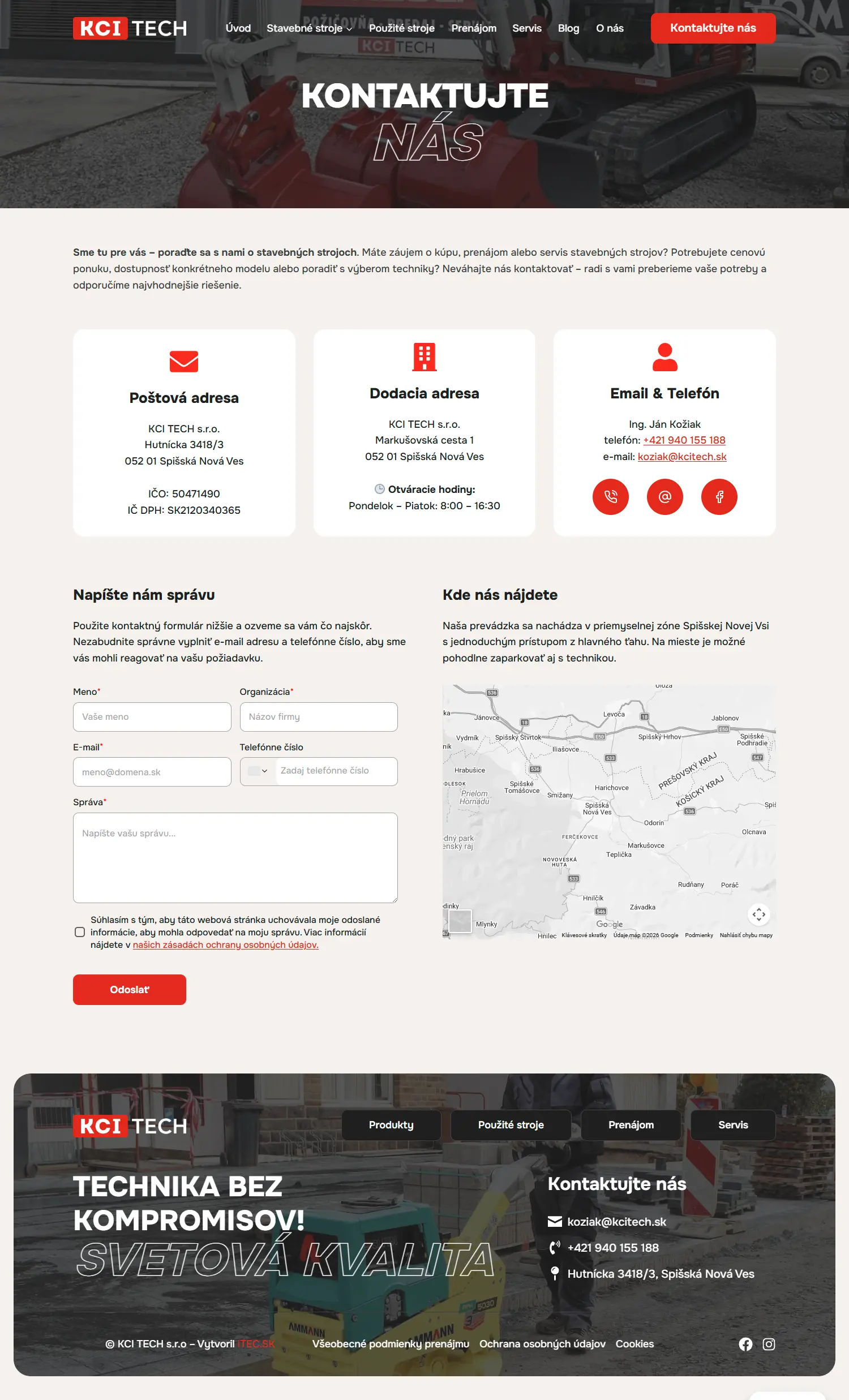 Pre spoločnosť KCI TECH s.r.o. sme realizovali kompletný redizajn webovej stránky www.kcitech.sk s cieľom modernizovať vizuálnu identitu, zlepšiť používateľskú skúsenosť a zvýšiť efektivitu online dopytov. Nová verzia webu prehľadne prezentuje predaj stavebných strojov, prenájom techniky aj ponuku použitých zariadení.